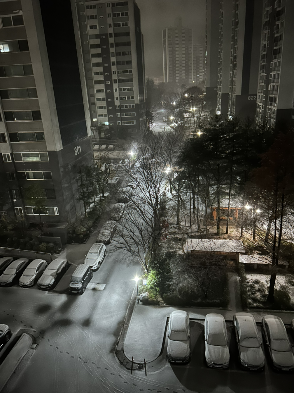 새벽 세 시 오십칠 분. 드문드문 불 켜진 집들이 보인다. 그들도 새벽의 흰 눈을 나와 같이 봤을 거라 생각하니 왠지 재미있고 입꼬리마저 올라간다.