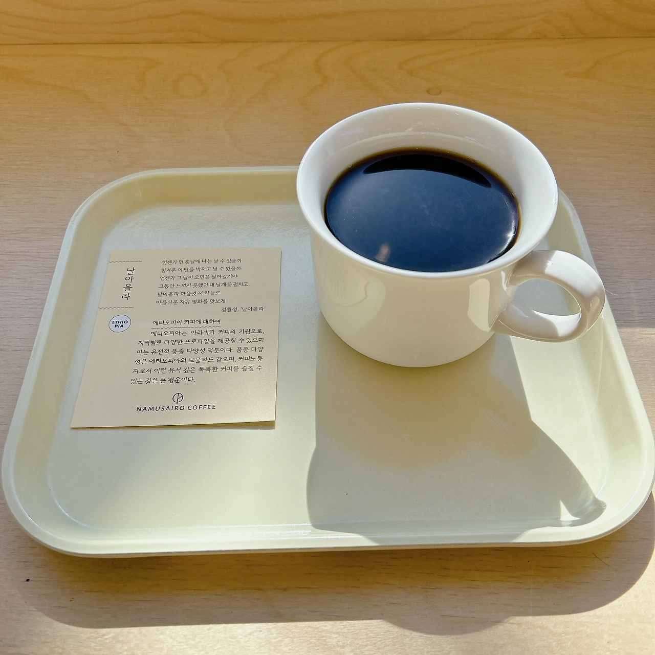 내가 주문한 에티오피아 커피가 나왔다. 한 모금 삼키고 나서 컵노트를 보니, 라임, 살구, 천도복숭아, 진한 과실과 라벤더의 복합적인 향기, 스카치캔디, 정향.