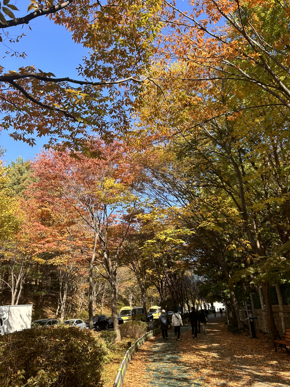이맘때쯤에는 우리 동네 산책로는 색을 특정하기 어려운 알록달록한 단풍잎과 노랑 은행잎들이 나뭇가지에 매달려 있으면서도, 바닥에는 붉은색과 갈색 낙엽들, 노란색 은행 낙엽들이 해진 융단처럼 듬성듬성 깔려있게 된다.