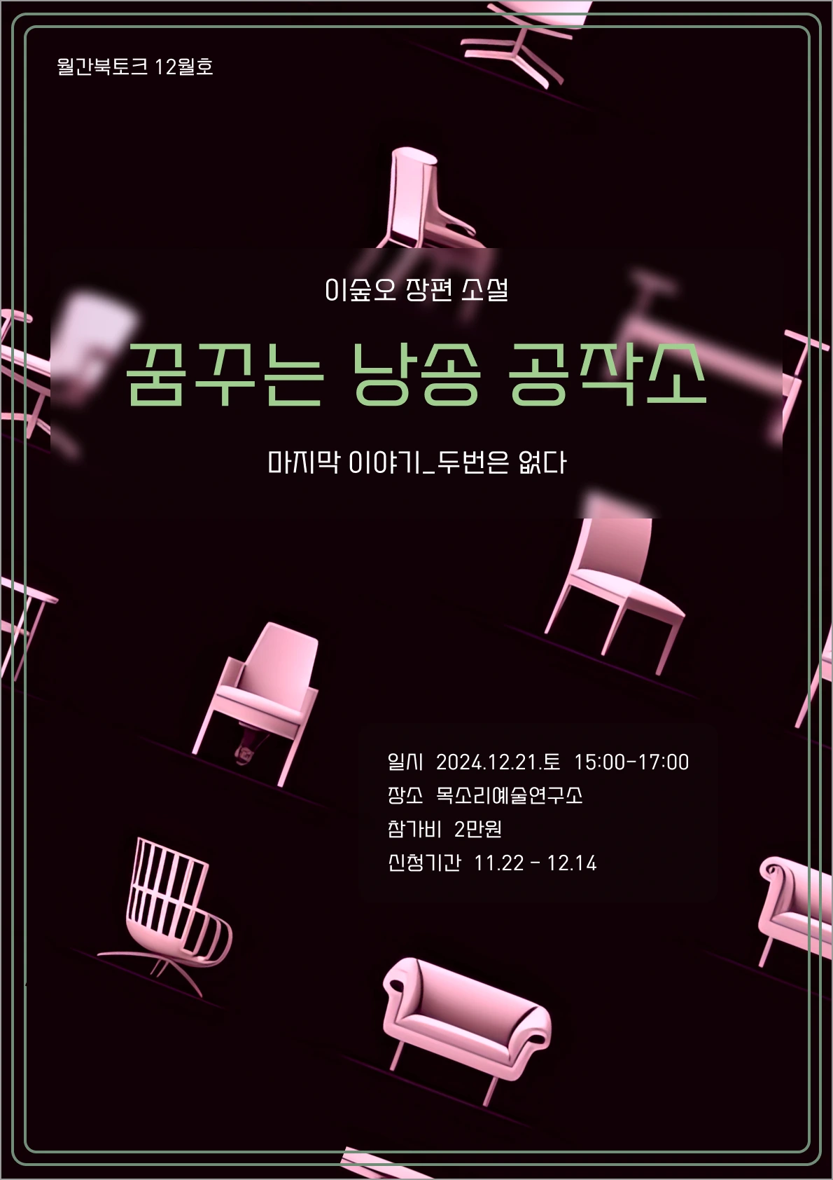 꿈꾸는 낭송 공작소 북토크 December 2024 | 처음은 들뜬 진초록의 단호박 껍데기처럼 호흡 거친 기대 같은 거였다. 열두 개 장을 하나씩 올릴 열두 번의 판타지 같은 상상의 문이 차례로 열렸다. 북