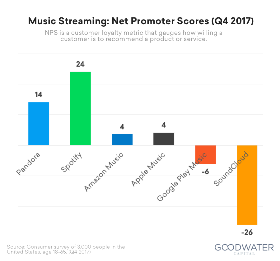 실제로 스포티파이의 사용자 만족도를 엿볼 수 있는 지표인 NPS (Net Promoter Score)를 보면 경쟁 회사 대비 압도적으로 높은 것을 알 수 있고, 경영진의 말이 충분히 설득력 있게 다가온다.