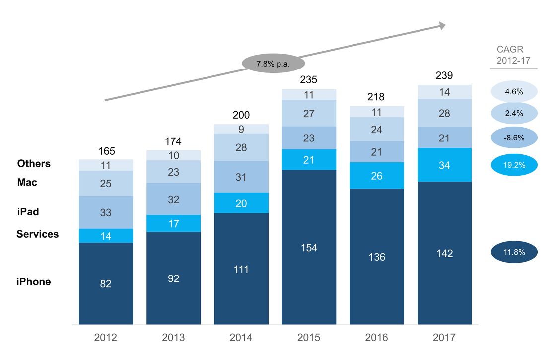 애플은 어떤 제품의 매출도 2012년부터 2017년까지 꾸준히 성장한 것이 없다. 심지어 매출의 절반 이상을 차지하는 아이폰조차도 2015년 정점을 찍고 하향세에 있다. 하지만 서비스만은 예외로 매출이 꾸준히 성장 중이다.