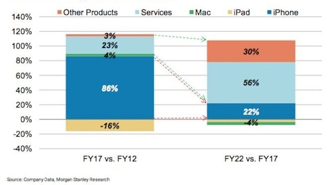 또한 모건 스탠리가 예측한 성장규모 역시 이런 트렌드를 반영하여 2022년까지 애플의 매출 성장에 서비스가 차지하는 비중이 56%이 될 것으로 예상했으며, 현재 캐시카우인 아이폰의 매출 성장 기여도는 2017년 86%에서 2022년 22%까지 떨어진다.