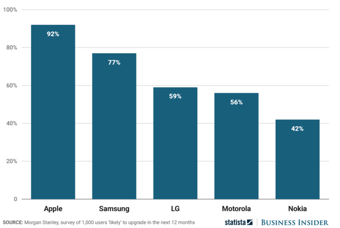 한 번 완성도가 높은 애플의 서비스들을 이용하면 애플의 에코시스템에서 벗어나기 힘든 Lock-in 효과가 있으며, 2017년 모건 스탠리의 소비자 조사 결과에 따르면 아이폰 사용자의 높은 충성도는 무려 92%에 이른다고 한다. 아이폰 사용자가 12개월내에 업그레이드시 아이폰을 재구매 할 의사가 92%라는 것이다.