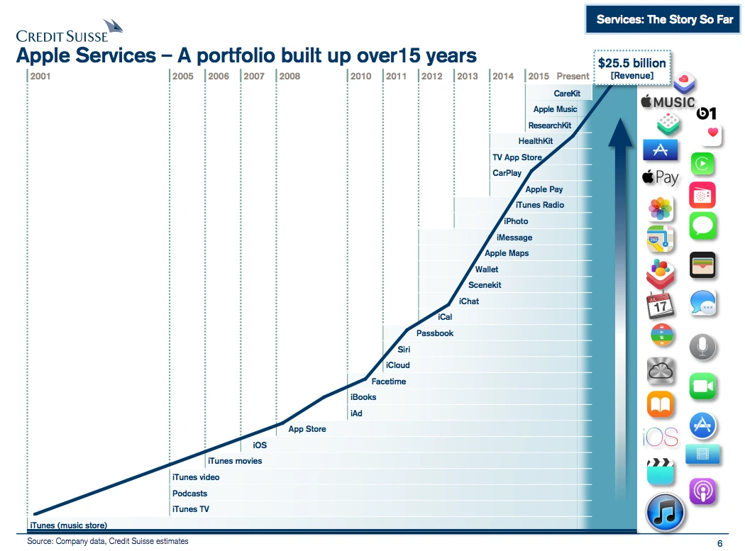 근데 이렇게 어마무시한 애플의 서비스는 하루 아침에 이루어진 것이 아니다. 아래 크레딧 스위스가 2016년에 그린 표를 보면 애플이 얼마나 꾸준히 서비스 비지니스를 꾸준히 쌓아가면서 만들었는지 쉽게 이해가 갈 것이다.