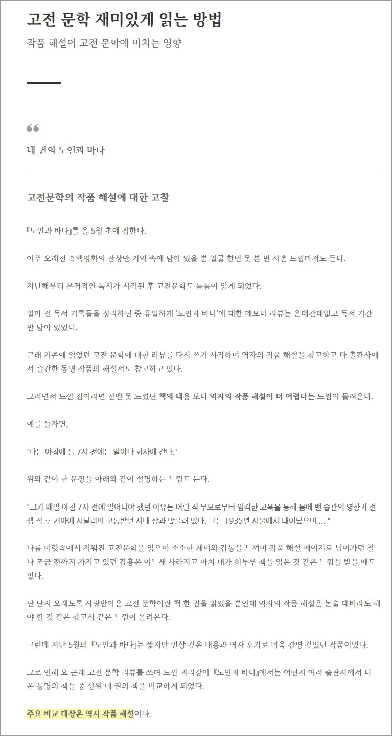 아래는 얼마 전 등록한 노인과 바다 4종을 비교하며 남긴 글의 일부분이다.
