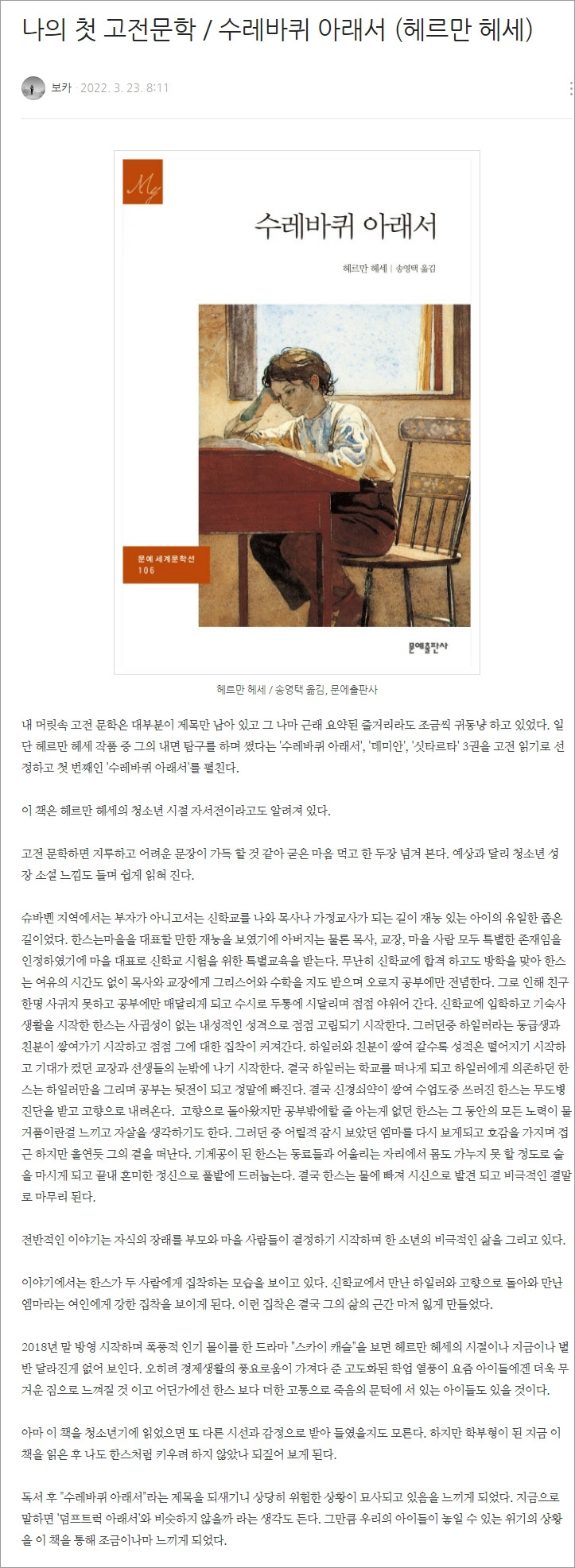 위 글은 올 3월에 '수레바퀴 아래서'를 읽고 남긴 리뷰이다.