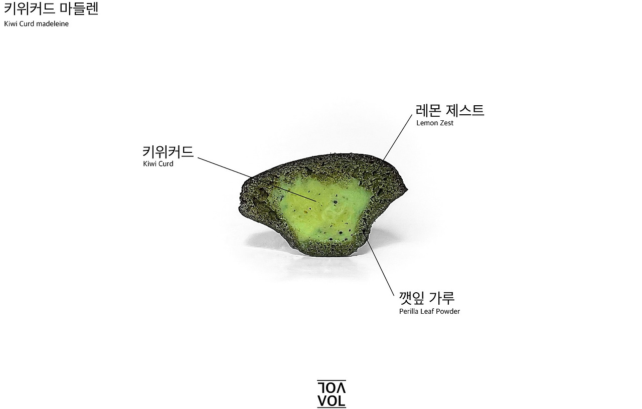 반죽에는 깻잎 가루를 넣었다. 처음엔 피스타치오 페이스트의 고소한 풍미와 상큼한 키위커드의 조화를 떠올렸지만, 이미 고소하면서도 진한 질감의 키위커드에 더 진득한 고소함이 더해지면 자칫 부담스럽게 느껴질 수도 있을 것 같았다. 조금 더 산뜻하지만, 은은한 풍미로 키위커드를 감싸 안아 줄 만한 재료가 필요했다. 마치 깻잎 같은. 깻잎은 디저트에 자주 사용하는 재료는 아니지만, 다소 강한 풍미가 마들렌 반죽과 어우러졌을 때, 마치 쑥처럼 향긋하고 고소한 풍미를 자아낼 수 있고, 은근히 화한 풀 향이 그린 키위에 감도는 은근한 풀 향과 좋은 조화를 이룰 수 있었다. 거기에 레몬 제스트를 소량 더하면 상큼하지만 진득하고, 고소하지만 너무 무겁지 않은 푸릇푸릇한 마들렌을 만들 수 있을 것 같았다.