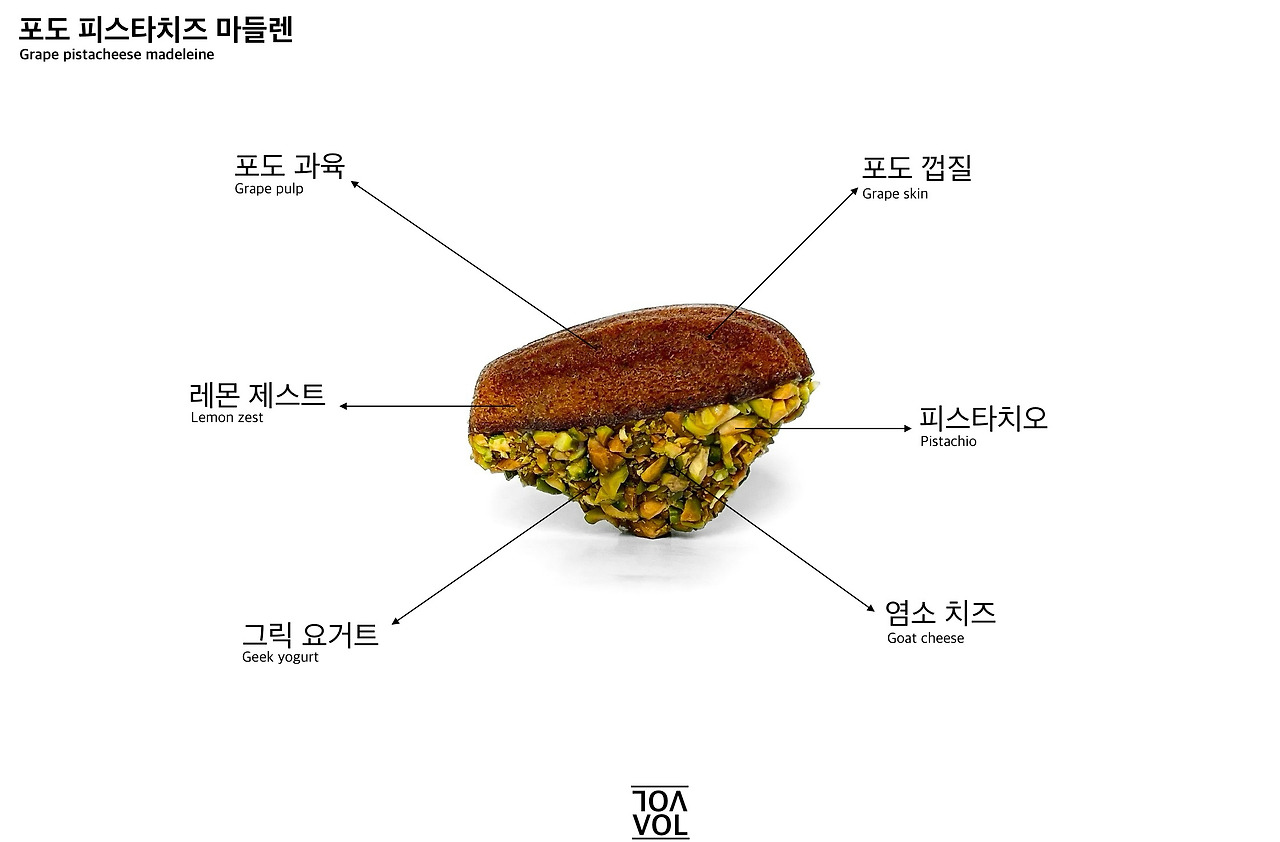 우선 반죽에 진한 포도 페이스트를 섞기 위해 포도 껍질을 벗겨내고 씨를 빼냈다. 포도 껍질에는 과육보다 훨씬 더 많은 아로마 성분이 농축되어 있으므로 버리지 않고 최대한 말려 주었고, 전자레인지에서 포도 과육의 수분을 충분히 날린 뒤 함께 갈아주었다. 피스타치오는 얇은 갈색 속껍질까지 모두 제거해서 좀 더 깔끔한 맛을 느낄 수 있도록 준비했고, 강한 존재감의 염소 치즈에 그릭 요거트를 섞어 치즈 크림을 완성했다. 사실 치즈 크림과 피스타치오로 마들렌 전체를 덮을지, 반만 덮을지가 가장 큰 고민이었는데, 확실하게 맛을 비교해 보기 위해, 둘 다 만들어 보기로 했다.