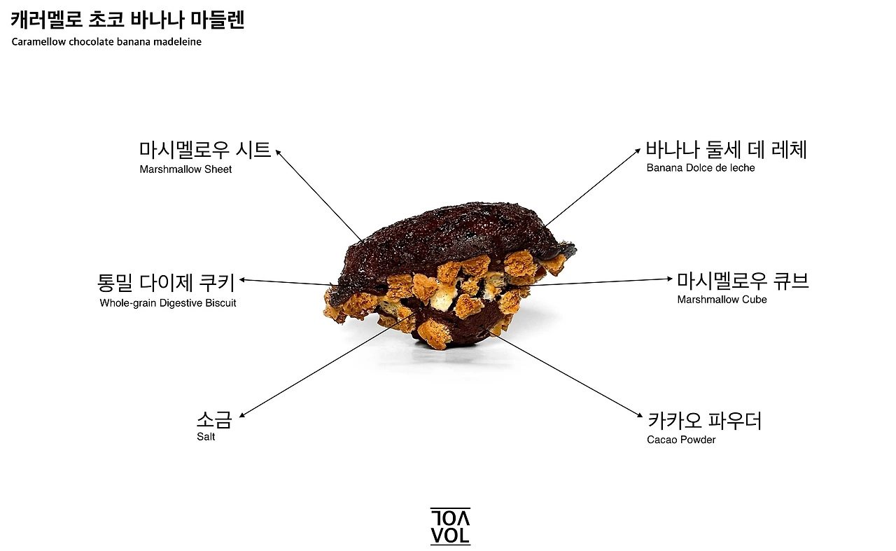 철 틀과 직접 닿아 제대로 캐러멜화된 마시멜로가 마치 파사삭 부서지는 크림 브륄레의 그을린 설탕처럼 아주 얇고 바삭한 껍질을 형성했다. 거기에 믿고 먹는 초콜릿, 바나나 그리고 캐러멜의 조화와 느끼한 맛을 잡기 위한 짠맛이 포인트가 되어주면서 바노피 마들렌과는 완전히 다른 인상의 새로운 마들렌이 탄생했다. 반죽 위에 올린 마시멜로는 쫄깃한 식감을 자아냈고, 캐러멜로와 함께 통밀쿠키가 특유의 고소함과 오독오독한 식감을 선사하니, 입안에서 단짠의 축제가 열린 듯했다.