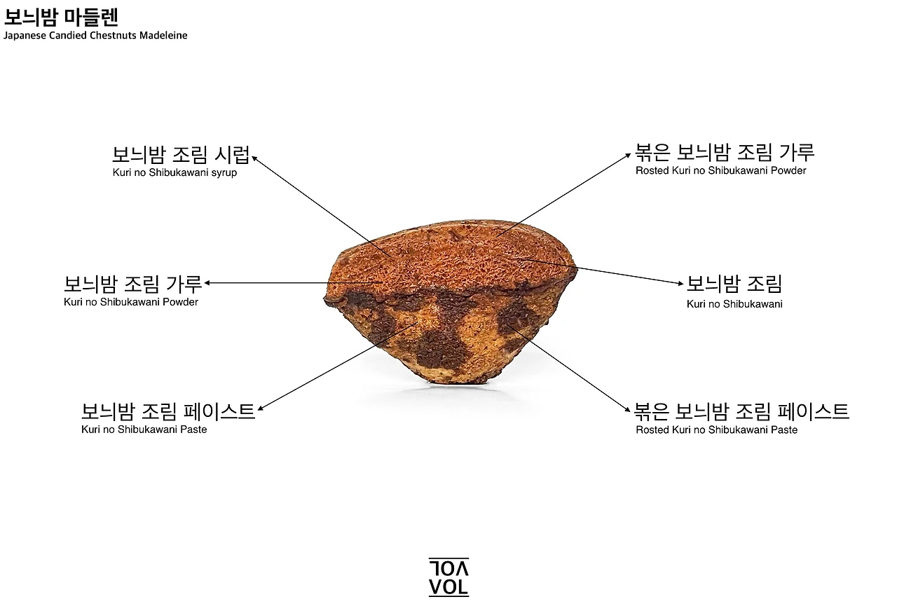 마들렌 반죽엔 보늬밤 가루와 볶은 보늬밤 가루, 그리고 보늬밤 시럽을 졸여서 섞어줬고, 표면엔 두 종류의 보늬밤 페이스트를 번갈아 얇게 발라줬다. 이번 보늬밤 마들렌의 핵심은 보늬밤, 그 자체였다. 보늬밤에는 밤 특유의 부드러운 구수함이 있고, 속껍질과 함께 조리면서 농축된 깊이 있는 단맛과 아주 흐릿한 쓴맛도 담겨있다. 이런 보늬밤 풍미에 마들렌의 은근한 버터 향과 입체적이고 고소한 견과류 풍미, 옅은 캐러멜 향 그리고 보늬밤을 만들 때 포인트로 더해줬던 커피 술의 풍미가 은은하게 더해졌다. 덕분에 폭신한 마들렌에 담긴 다채로운 보늬밤의 풍미를 한꺼번에 만끽할 수 있었다.