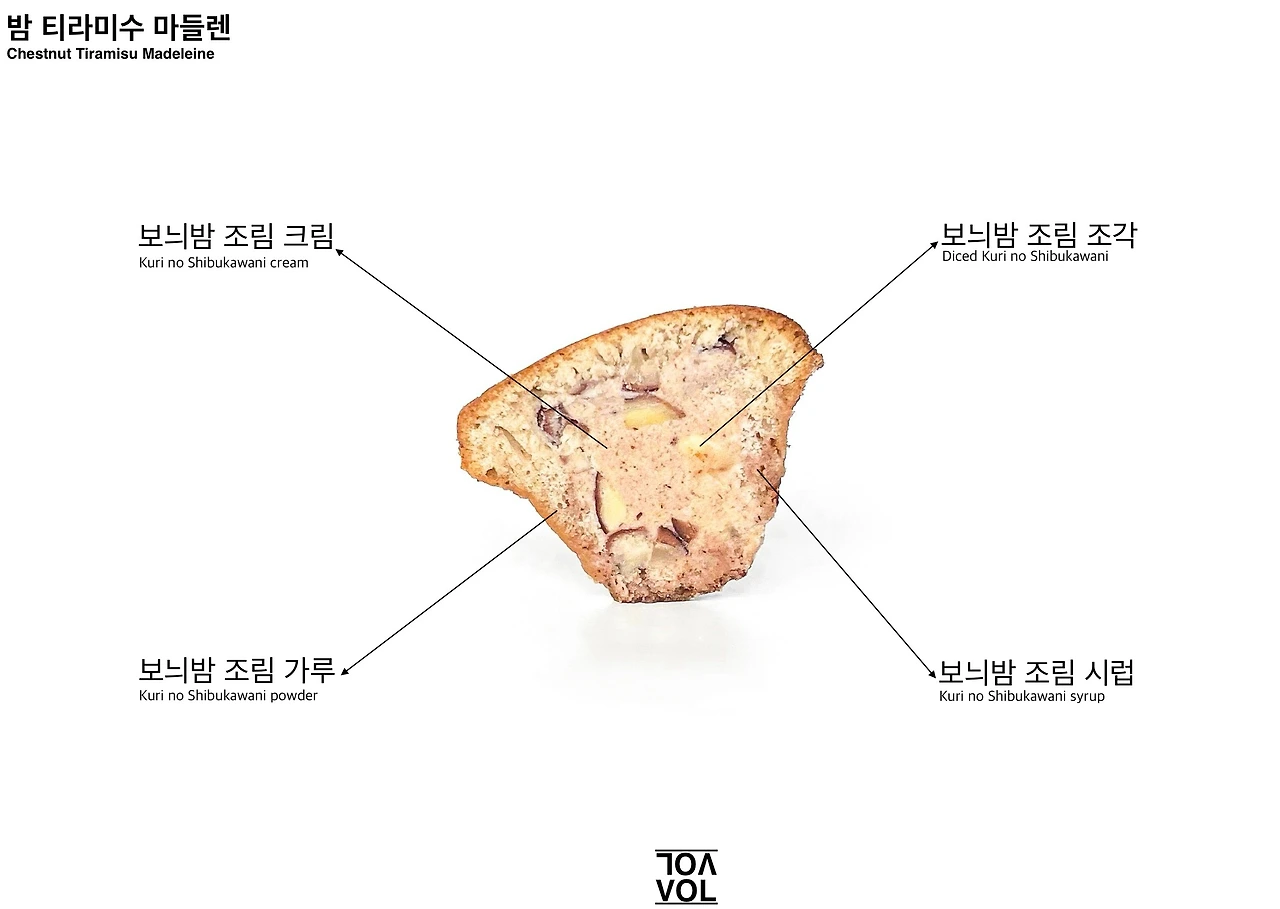 올해는 보늬밤 조림을 만들기 전 워낙 많은 밤 마들렌을 만들었기에 따로 마들렌은 만들지 않으려다가 저번 주 사용하고 남은 마스카포네 치즈를 소비하기 위해 밤 티라미수를 주제로 마들렌을 만들어 봤다. 이미 보늬밤 조림을 만드는 걸로 내 욕심은 다했으니, 더 이상 몸 상하는 일이 없도록 그저 보늬밤 자체의 맛을 오롯이 담은 형태로 만들었다.