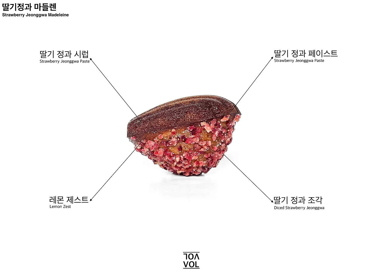 재료 자체에는 큰 변화를 주지 않았다. 다만, 저번과 달리 브랜디를 적당히 희석해 딸기 정과를 불렸다. 딸기 정과를 브랜디에 불리면 과육이 부드러워져 반죽에 섞기도 좋아지고, 단맛이 어느 정도 잡힌다. 단맛을 적당히 조절한 뒤 갈아 넣으면 정과의 맛을 훨씬 선명하게 느낄 수 있다. 소량의 레몬 제스트로 상큼함을 더하는 것도 잊지 않았다. 가장 중점으로 뒀던 건 역시 정과의 아름다운 맛과 향을 살리는 것이었다. 또한, 그 모습을 오롯이 담는 일에도 신경을 썼다. 맛은 입으로 보지만, 눈으로도 느낀다. 그래서 저번처럼 정과를 함께 굽지 않고, 다 구운 뒤에 살짝 올려서 짧게 한 번 더 구워냈다.