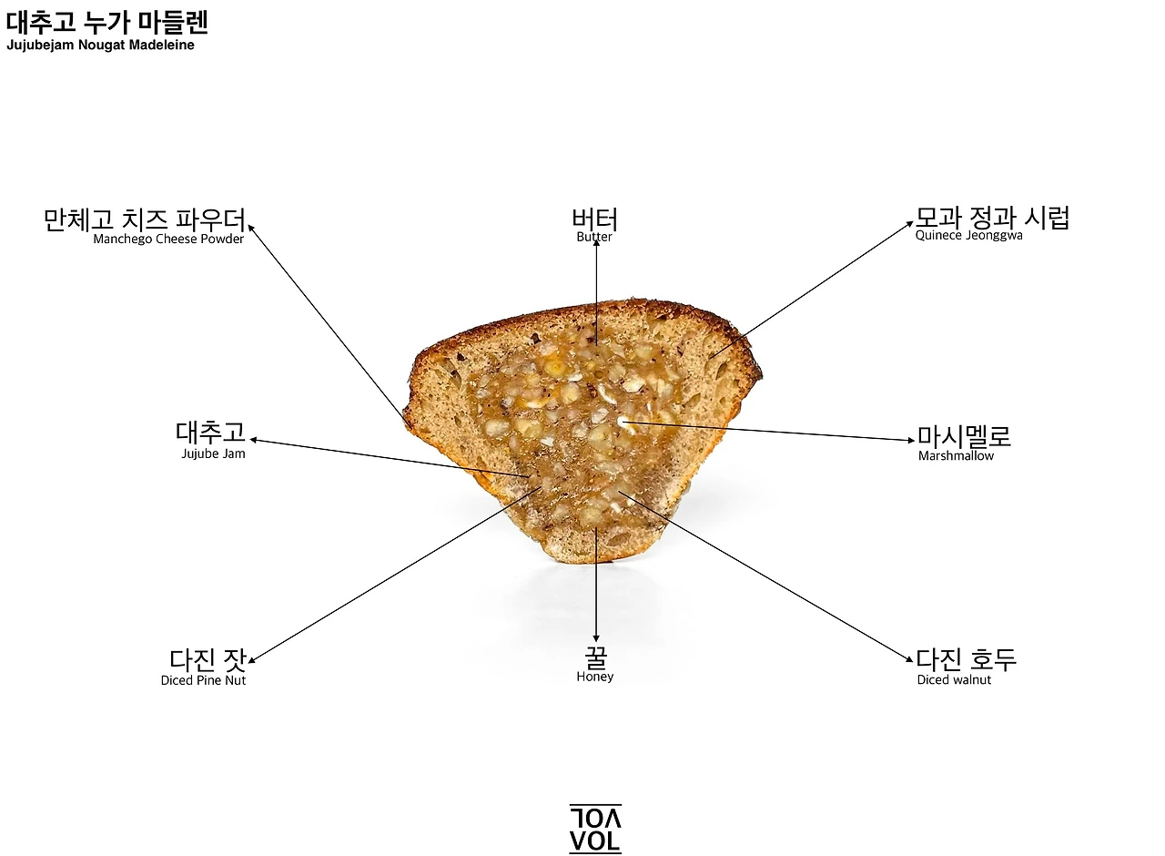 대추고 누가는 전자레인지로 빠르게 완성했다. 녹인 버터에 마시멜로를 넣고 아주 짧게 가열한 뒤, 따뜻한 상태의 대추고와 견과류를 섞었다. 견과류는 대추고와 합을 맞춰 한국적인 정취를 더해줄 잣과 호두를 잘게 다져 준비했다. 거기에 꿀을 살짝 더해 누가 특유의 풍미를 입혔다. 그렇게 대추고 누가 마들렌이 완성되었다.
