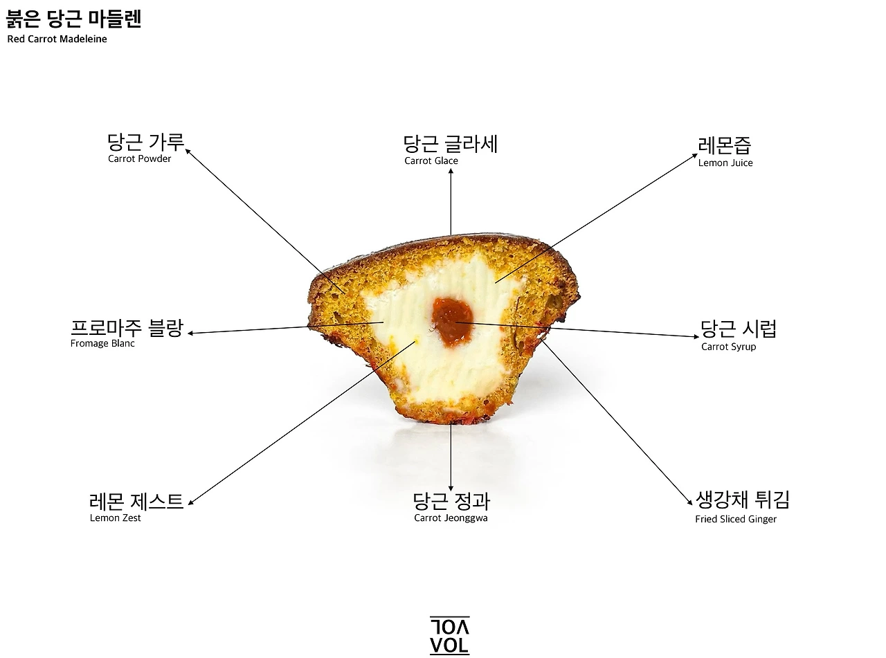 하지만 완성된 마들렌의 모습은 생각과 사뭇 달랐다. 원래는 얇게 저민 당근을 꽃 모양으로 찍어서 정과를 만들 생각이었는데, 즙을 내고 남은 당근 과육이 너무 아깝게 느껴졌다. 그래서 과육은 바짝 말려 반죽에 소량 더하고 나머지는 설탕과 레몬즙, 제스트와 함께 조려 바삭한 정과로 완성했다. 당근즙은 수분을 날리고 진득하게 졸여 일부는 반죽에, 나머지는 글라세에 활용했다. 프로마주 블랑에 레몬 제스트를 섞어 상큼한 필링을 준비하고, 당근 즙에 담가 신맛을 중화한 베니 쇼가를 튀겨 정과와 함께 반죽 위에 올렸다.