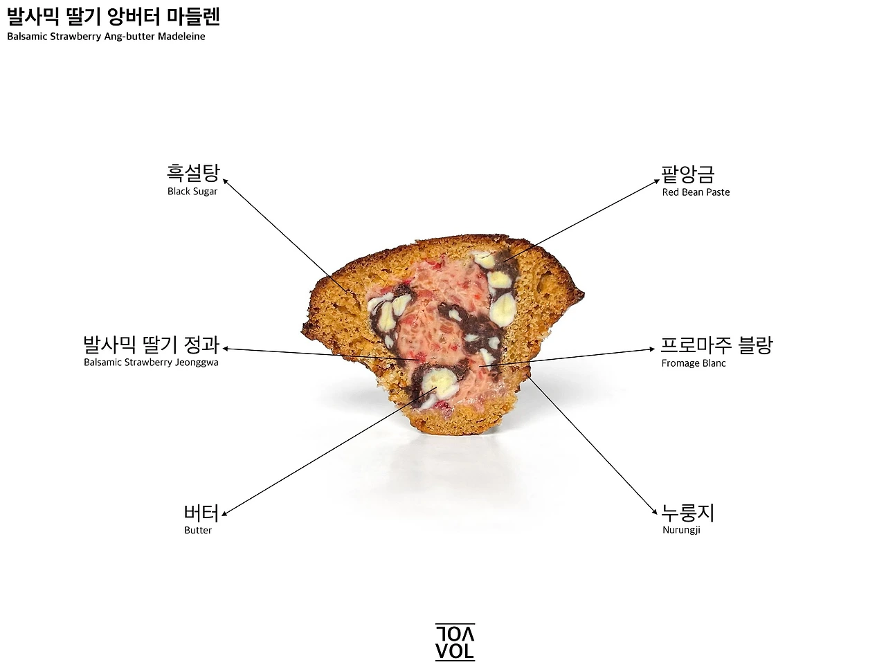 사실 한 가지 마들렌에 담아내기엔 필요한 요소가 꽤 많았다. 기본적으로 발사믹 식초와 딸기, 리코타 치즈, 버터와 팥앙금이 함께 들어가야 했는데, 각 재료를 어떤 형태로 구현할지가 가장 큰 고민이었다. 처음엔 강조하고 싶은 맛을 필링으로 만들고, 나머지는 반죽에 섞어 베이스로 활용하려 했는데, 그러면 제대로 된 느낌을 담아낼 수 없을 것 같았다. 결국 합칠 수 있는 부분은 합쳐서 단순화하고, 살릴 수 있는 부분은 살려서 마들렌의 문법으로 재해석했다.