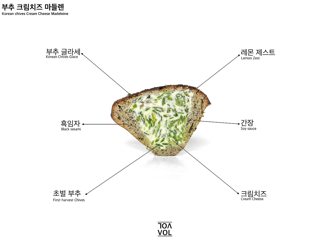 그렇다면 준비할 건 마들렌 반죽뿐이다. 반죽에 무엇을 넣어야 할까 고민이 많았지만, 결국 흑임자를 중심으로 결정했다. 특유의 고소한 맛을 더하면서도 크림치즈 필링과 색감의 대비를 이루어 멋진 마들렌이 될 것 같았다. 킥으로 준비한 재료는 바로 간장. 평소에도 자주 즐기는 부추와 간장의 절묘한 조화를 떠올리며 간장을 소량 섞어 은은한 짠맛과 감칠맛을 가미했다. 레몬즙을 베이스로 부추를 잔뜩 다져 넣은 글라세를 발라 가벼운 산미와 선명한 부추의 존재감을 강조했고, 약간의 레몬 제스트를 올려 마무리했다.