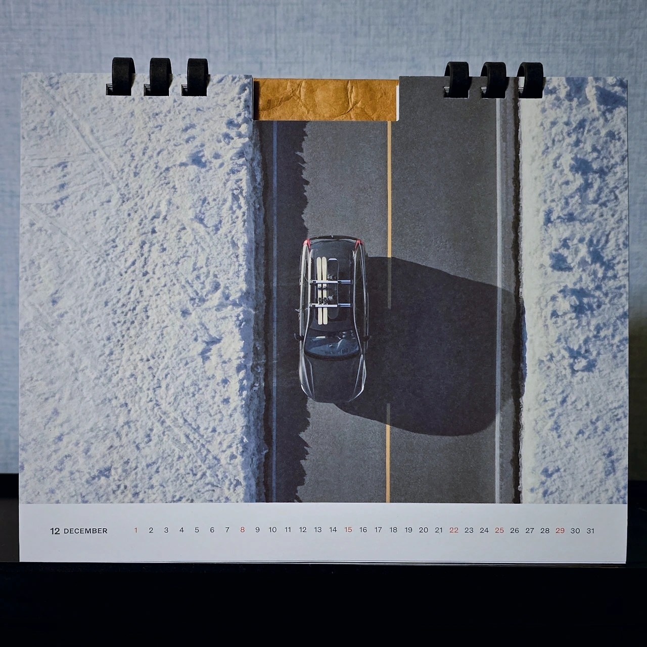 사진에서 또한 특이한 부분은 차 방향이 아래쪽으로 향해 있다는 것입니다. 보통은 이런 사진구도는 운전자를 기준으로 차량의 직진성을 고려할때 보닛이 위로 향하는게 일반적인데 말이죠. 그치만, 또한 다른 관점으로 보면, 위에서 아래로 내려오면서 한해의 마무리를 의미할 수 있겠다 싶었습니다. 그런 의미에서 예전 볼보 달력에서는 12월 이미지가 XC90의 뒷모습이기도 했지요.