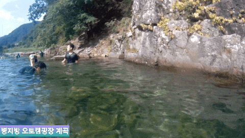움짤로 만들면서 화질이 좀 안좋아져서 잘 안보이실 수도 있는데, 물고기들이 엄청 많습니다. 열대바다 스노클링도 좋지만, 이렇게 계곡에서 하는 스노클링도 재미있고 좋더라구요. 구명조끼 입은 상태에서 저렇게 잠수하고 둥둥 떠다니며 물속을 보니, 지대로 힐링각입니다.