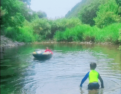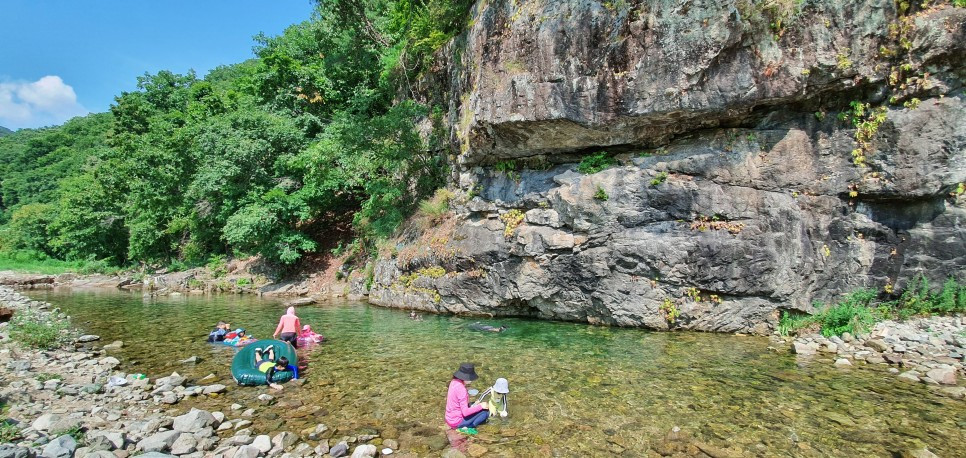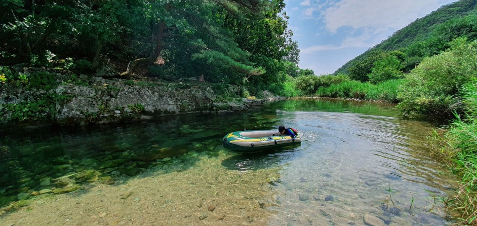 아들은 계곡에 도착하자마자 탄성을 질렀습니다. 오전에 도착해서 그런지, 계곡에 아무도 없더군요. 완전 프라이빗 계곡 같았습니다. 계곡물이 맑더라구요. 가장 중요한 물깊이를 보니, 약간 위험하다 싶을 정도로 깊은 구간이 있었습니다. 일단 저도 구명조끼를 입고, 아들도 구명조끼를 입혔습니다. 제가 먼저 들어가서 물깊이를 확인해보니, 제 가슴 아랫쪽 까지 올라오더군요. 이 정도면 수영을 어느정도 하는 아들한테도 물깊이는 위험수준은 아니었지만, 그래도 방심은 금물이니, 일단 구명조끼를 입혀서 놀게 했습니다. 아들은 보트를 타면서 신나게 물놀이를 하기 시작했습니다. 아들이 기뻐하면서 물놀이를 하는 모습을 보며, 마음이 놓이더라구요. 혹시나 마음에 안들면 어쩌나 했는데 말이죠.ㅎㅎ 성공적!!
