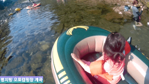 아들은 이제 계곡에 적응을 했는지, 구명조끼를 벗어 던지고, 놀기 시작했습니다. 저는 딸을 보트에 태워서 유람선모드로 계곡을 선회하고 있었습니다. 딸은 좋아하면서도 겁이 났는지, 의외로 물에 들어가려고 하지 않았습니다. 물론 딸아이에게는 물깊이가 위험하기 때문에 부력조끼를 입히긴 했지만, 그럼에도 딸은 안심이 안되었는지 아들처럼 푹 들어가지는 않더군요. 푸르딩딩한 물색깔이 겁이 났던 것일까요?