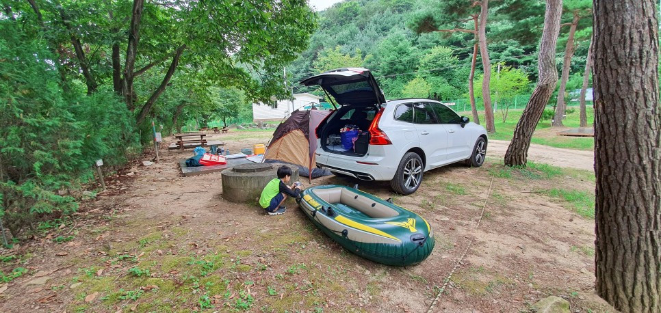 제가 캠핑자리에 주차를 하고 준비를 하는 동안 아들은 '아빠, 언제가요? 빨리가요!' 라고 조르더군요. 아빠, 엄마가 텐트치고, 짐정리하고...바쁘게 준비하고 있는 거 안보이냐? 이럴때는 정말 인내심의 한계에 다다르기도 합니다. (네 흔한 일상이죠. ㅎㅎ) '그렇게 빨리 놀고 싶으면 저기 뽀트에 바람이라도 넣던지!' 라고 하며 전동 공기주입기를 XC60 트렁크 쪽에 전원잭에 연결한 후에, 아들에게 바람을 넣으라고 알려줬습니다. 자기도 놀고싶은 마음에 제법 잘 넣더군요.ㅎㅎ