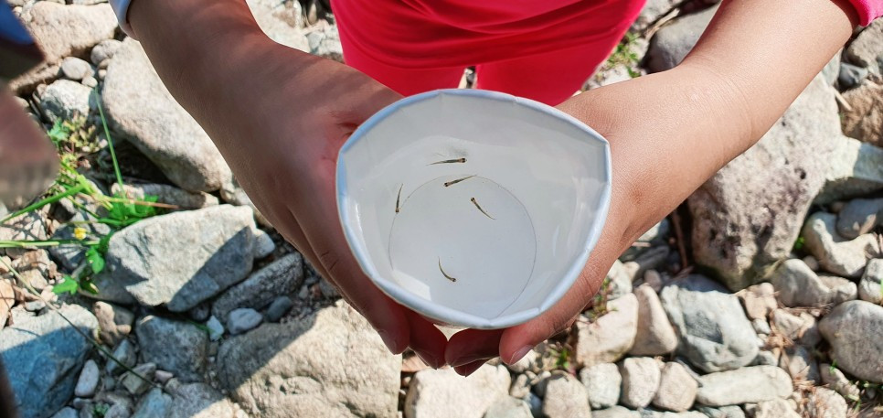 그래도 아가 물고기는 잡았습니다. (아들이 아니라, 아내가요 ㅎㅎ) 딸이 좋아하더라구요, 딸은 한동안 물고기멍을 하더군요. ㅎㅎㅎ 딸만의 힐링인가봅니다. 딸의 힐링이 만충되었는지, 아가 물고기니까 이제 다시 보내주자며, 다시 계곡에 방생 했습니다.