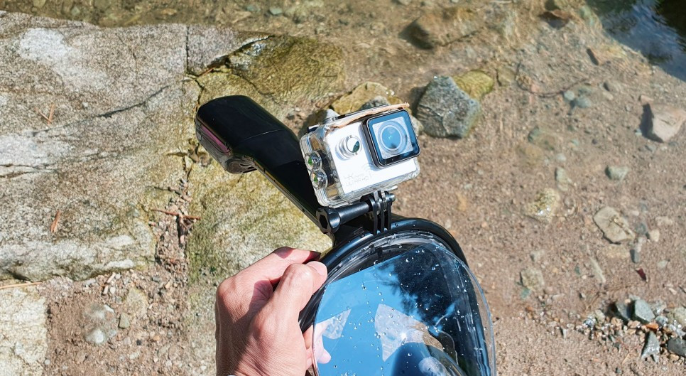 예전에 한참 쓰던 액션캠(짭프로)인데요... 스노클링 마스크에 이렇게 액션캠을 부착할수 있더군요. 한 동안 서랍에 유배당했다가 오랫만에 복귀한 액션캠입니다.ㅎㅎ. 전날 루지체험장에서도 다이나믹한 루지 레이싱을 찍었던 그 액션캠이죠. ㅎㅎ (이 액션캠이 다음 날 또 열일합니다. 그 이야기는 다음편에..) 아내가 아들의 스노클링 마스크 살때, 저한테 '자기도 하나 살래?' 라고 물어보더군요. 굳이 필요 없을거 같아서 한 10.6초를 고민했습니다. 그래도 한번 써보자 하고 샀는데... 어휴... 안샀으면 크게 후회할뻔 했습니다.ㅎㅎㅎ 이거 쓰고 잠수하면 엄청 편하고 좋고 재미있더군요.^^