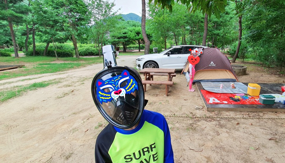 아들은 뽀트에 바람을 넣은 후 이번에 휴가를 위하여 새로 산 스노클링 마스크를 쓰고 빨리 계곡에 가자고 했습니다. 원래는 XC60과 텐트의 구도를 잡아 사진을 찍으려고 한건데, 아들이 방해공작을 펼친거네요... 으휴 ㅎㅎ 그래 알았다~ 가자~ 가~ ㅎㅎ
