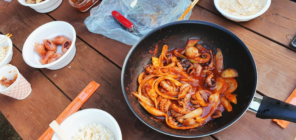 아내는 계곡에서 같이 놀다가 저녁준비로 딸과 함께 캠핑사이트로 돌아갔습니다. 저녁 메뉴는 쭈꾸미 볶음이었지요. 볼보여정기 여름휴가 1편, 2편에서 먹방이 안나왔지요? 그도 그럴것이 시국이 시국인지라, 아내는 식당에서 사먹는 계획은 일절 잡지 않고, 간단하게 해먹을 수 있는 것 위주로 준비했었습니다. (햇반, 오뚜기3분요리, 컵라면, 데워서 먹는 국류 등). 이와중에 쭈꾸미 볶음은 호화 요리였지요. ㅎㅎㅎ 이것 말고도 고기도 구웠는데... 사진으로 담지는 못했네요.ㅠㅠ. 우리 가족은 캠린이도 안되는 차크닉이나 조금 하는 수준이라 캠핑고수같이 화려한 캠핑 요리 메뉴는 안됩니다. 단촐하지만, 정말 맛있게 캠핑지에서 식사를 하였습니다. 물놀이 하고 먹는 저녁이라서 더욱 맛있다라구요. 저녁 식사후 복귀를 위해 짐을 정리하니 해가 지고 어둑어둑해지더군요. 다시 1박 예약한 무인텔로 향했습니다.