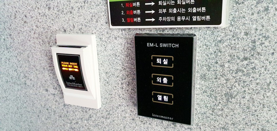 아침식사 후 퇴실처리를 하였습니니다. 퇴실 처리는 현관앞에 저렇게 퇴실 스위치를 누르면 됩니다. 보통 모텔이나 리조트처럼 키가 따로 있지도 않더라구요. 그냥 예약후 싸장님께 전화한통 걸면 체크인 처리되고 문을 열어주더라구요, 퇴실하는 것도 저렇게 간편합니다.