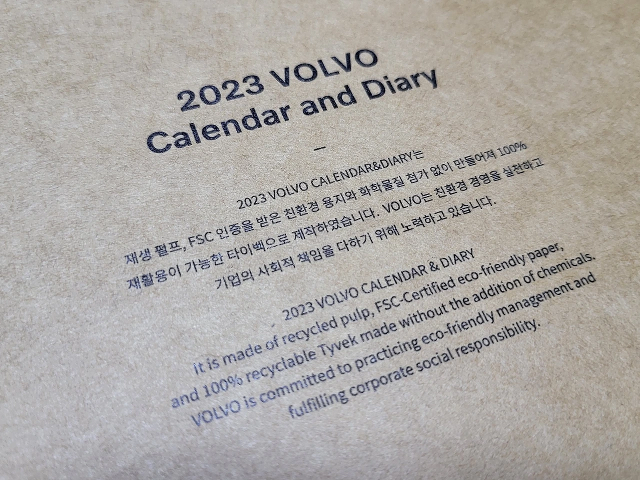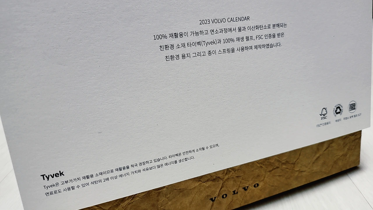 볼보 캘린더 세트를 언박싱하니 이런 문구가 눈에 먼저 들어옵니다. 친환경 용지와 100% 재활용이 가능한 타이벡으로 제작했다고 합니다. 요즘 글로벌 기업들의 친환경, 사회적 책임 기반의 경영이 브랜드 이미지에 중요한 역할을 하지요, 볼보도 예전부터 이런 경영을 실천해 왔었습니다.