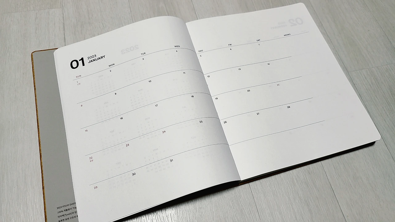 볼보 다이어리의 내지의 앞부분은 월별 달력에 메모를 할 수 있습니다.