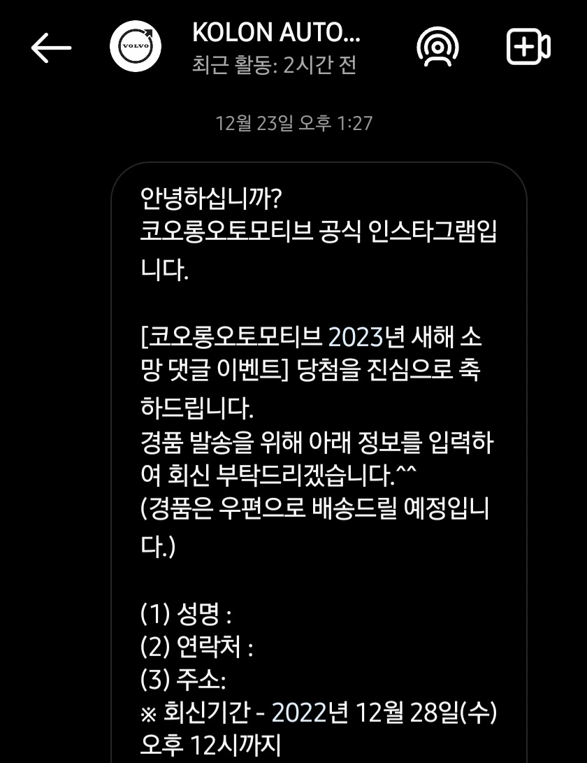 이렇게 문스톨님께 볼보 캘린터 세트를 받은 후, 얼마 안되어... 볼보 코오롱오토모티브 인스타그램에서 DM이 오더군요. 볼보 캘린더 이벤트에 당첨이 된것이었던 것이었습니다. 롸? 당첨? 내가 당첨이라니! 내가 당첨이라니!! 제가 코오롱오토모티브에서 출고를 받아서 당첨된걸까요? (아닐껄?) , 예전에 '코오롱오토모티브 데이' 이벤트에 대해서 글을 쓰고, 유튜브 영상을 만들어서 당첨된걸까요?(아닐껄?), 그렇다면 제가 쓴 볼보달력 2022년 12월 이야기를 보고 당첨시켜준걸까요?(그건 더욱 아닐껄?), 판교전시장 S90 시승 CHECK IN 이벤트의 영상을 만들어서 그런걸까요?(그건 더더욱 아닐껄?, 예전에 H모터스 서현 전시장에서 C40리차지 로드쇼 영상도 만들었자너!) 이런 행운이! ㅠㅠ 네... 나머지 볼보코리아 와 다른 딜러사의 볼보캘린더 이벤트는 모두 꽝이었습니다. (아, 뭐... 솔직히 아쉬운건 사실이지만, 볼보를 좋아하는 마음으로 계속 활동하고 응모하면 언젠간 또 다른 이벤트 당첨 기회가 있겠죠~)