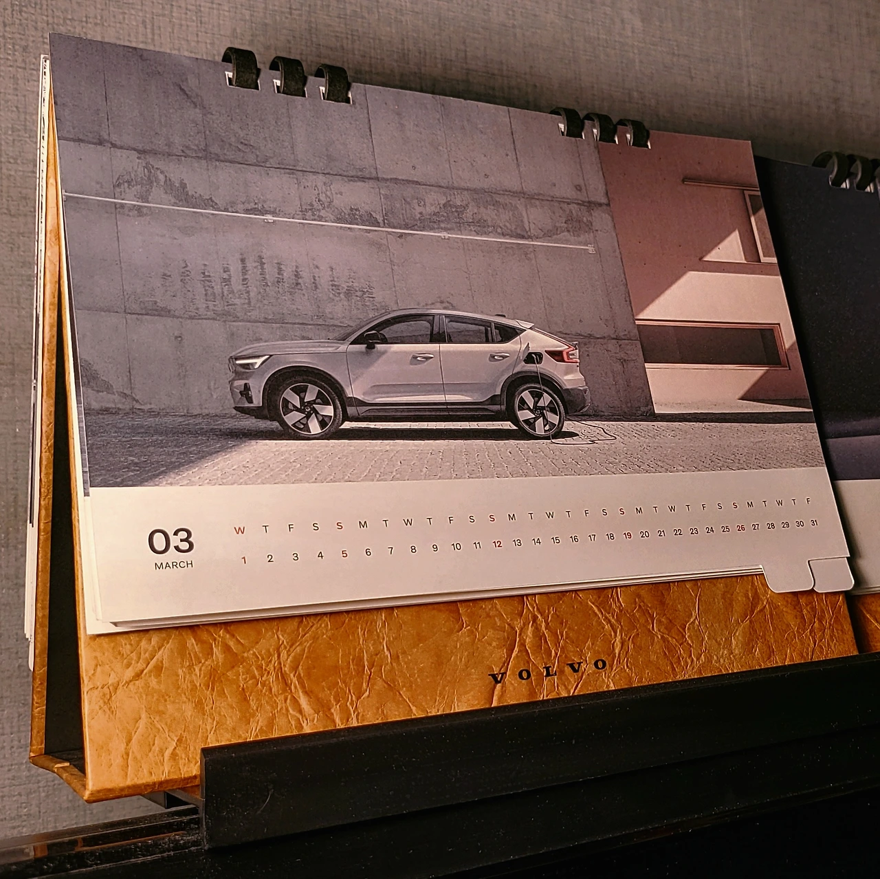 달력 사진의 C40리차지의 외장 컬러는 실버던(Siver Dawn, 컬러코드 735)입니다. 실버 던은 제가 C40 리차지 로드쇼 시승행사 때 실제로 봤던 컬러입니다. 실버 던은 빛의 색상에 따라 오묘한 색감의 변화가 매력적인 컬러입니다. 사실 개인적으로 C40리차지는 실버 던도 멋지긴 하지만, C40리차지는 무채색 계열보다는 유채색 계열 외장 컬러가 더 잘어울리는 느낌입니다. 흠.. 쿠페타입이라 그런것일까요? 피오르드 블루(Fjord Blue컬러코드 734)나, 퓨전 레드(Fusion Red,컬러코드725)컬러가 C40의 느낌을 한층 더 끌어올리는것 같더라고요, 실제로 C40리차지 TV광고에서도 피오르드 블루가 시그니처 컬러로 메인 샷을 장식했지요.