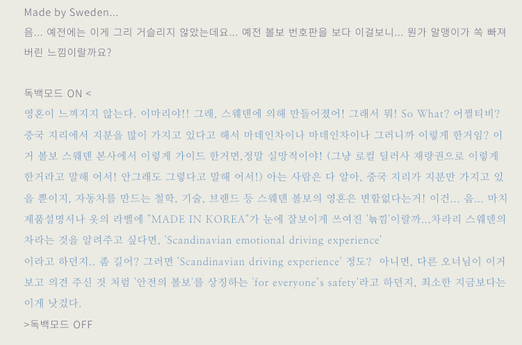 물론 볼보차량의 번호판 가드에 MADE BY SWEDEN을 적용한 의도는 정확하게 알 수는 없다. 이건 볼보 코리아와 볼보 스웨덴 본사의 정책적인 사항일테니까. 그렇지만 분명한건... MADE BY SWEDEN은 작위적으로 지어낸 것이 아니라, 볼보의 컨텐츠에 이미 있었던 문구라는 것이다. 그리고 이 책의 스토리 라인에서 적용된 문구일 것이라고 개인적인 추측을 해본다. (그 추측이 맞기를 간절히 또 바란다.) '영혼이 느껴지지 않는다'라고 한 건, 당시 이 책의 존재를 몰랐기에 할 수 있었던 말이었다. 이 책의 내용을 보면 영혼이 느껴지지 않는다라는 말은 더욱 더 역관광을 당할 것이다. 인정할건 인정해야지...