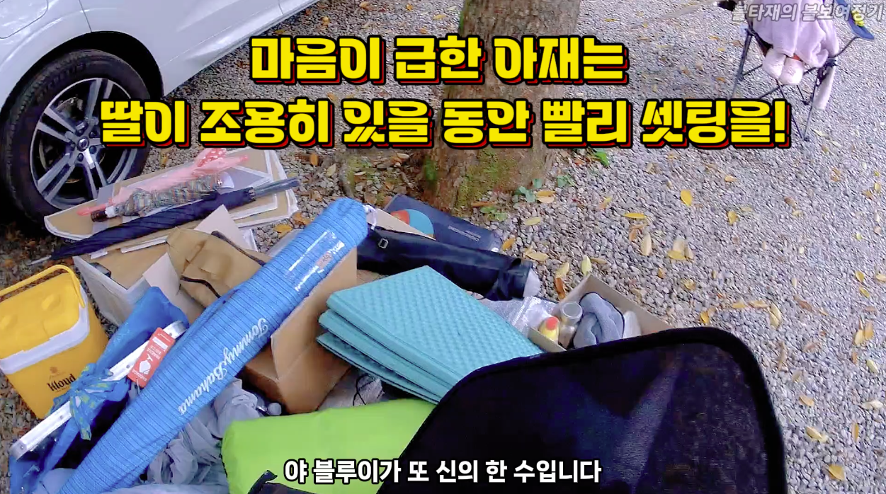 모든것이 처음이라 서툴고 동선은 효율적이지 못했죠..저는 계속 이리저리 분주하지만 비효율 적으로 움직이면서 셋팅을 이어나갔고요. 그와중에 딸의 요구사항은 계속 들어옵니다. ㅎㅎㅎ 딸의 요구사항을 들어주며, 캠핑셋팅을 하니 증신이 하나도 없더군요.