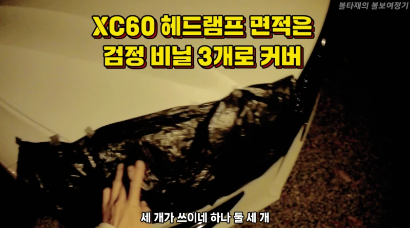 밤이 깊어감에 따라 잠자리를 준비 했습니다. 야간에 하이브리드 모드로 시동하게 되면 헤드램프가 켜지가 때문에 빛을 가리기 위해 검정 비닐봉지를 붙였습니다. 검정 비닐봉지는 XC60기준으로 한쪽 헤드램프당 3장정도 필요합니다. 헤드램프의 투사 모드는 미등모드로 하게 되면 리어램프는 켜지지 않고, 헤드램프는 미등으로 켜져서 빛이 강하게 투사되지 않습니다. 차박할때는 꼭 이 셋팅을 맞춰야 다른 캠핑사이트에 민폐를 방지 할 수 있습니다.