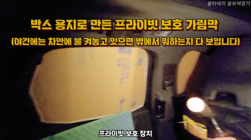 그리고 차안에서 불을 켤때 밖에서 안이 보이지 않도록 박스용로 제작한 윈도우가리개를 부착했습니다. 이거, 막상 구입하려면 비용이 꽤 들어가더군요. 저는 비용을 들이지 않고, 시간을 꽤 들여 만들었습니다. ㅎㅎ 성인 두명이 자기에 딱 좋았습니다. (커플이라면 아마 므흣한 스킨쉽을 연출할 수 있을 ㅎㅎㅎ)