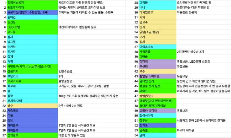 끝으로 제가 차박을 준비하면서 정리한 캠린이의 '차박 준비물'을 공유합니다.