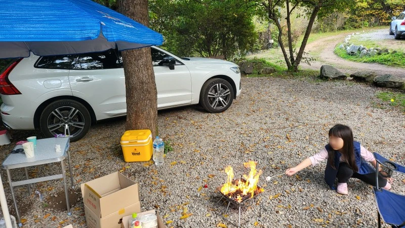다시 우리 캠핑사이트로 돌아와서 불을 일찍 피웠습니다.화로대는 불멍용, 괴기구이용으로도 사용할 수 있지만, 난로로도 훌륭한 역할을 한다는것도 이번 차박 캠핑을 통해 알았네요. 밤에만 피우는게 아니라 쌀쌀한 날씨에는 낮에도 피워서 체온손실을 막을 수 있더군요. 딸이 감기 걸리지 않게 하기 위해서라도 바로 불을 피웠습니다. 자동토치가 있어서 불피우는데는 크게 어렵지 않았습니다. 자동토치는 필수네요. 종이로 불붙이려면 한참 고생했을것 깉은 ㅎㅎ 저는 10Kg장작이 너무 많아서 덜어가려고 했는데... 덜어갔다가는 낭패를 볼뻔했습니다. 낮부터 불피워서 밤까지 유지하려면 장작이 생각보다 많이 소모 되더라고요.