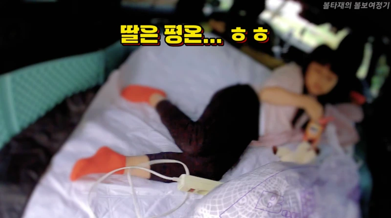 이렇게 일단 아재와 딸은 잠자리에 들었습니다. 자충매트+ 스폰지 매트 + 볼보 피크닉매트 조합으로 바닥을 깔았는데 나름 푹신하고 따뜻하더라고요, 즌기요를 틀지 않았는데도 따뜻한 매직! ㅎㅎ