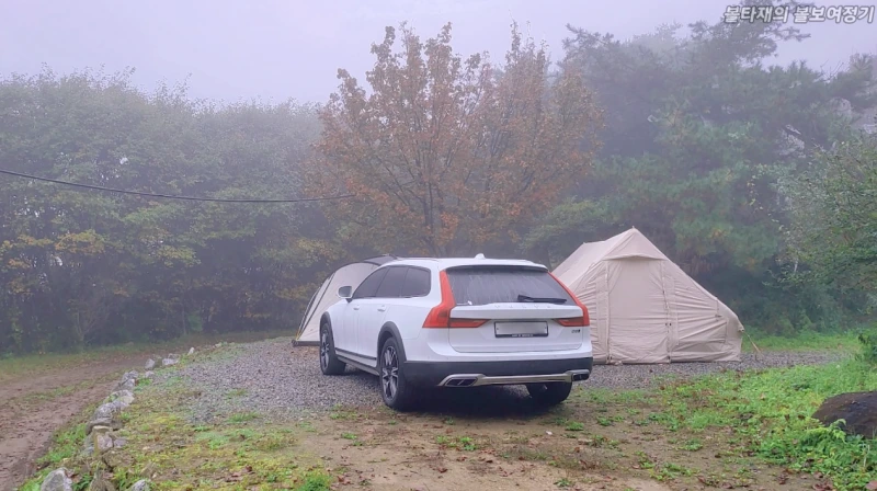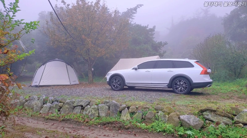 아침이 되어, 일찍 일어나 저는 2열 문쪽으로 내렸습니다. 딸이 아직 자고 있기에 저는 문을 잠궜죠. 캠핑장에 안개가 끼어서 분위기가 참 좋더군요. 안개속에 캠핑텐트와 함께있는 옆사이트의 V90CC를 보는순간, 와 이건뭐, 그냥뭐 확그냥 막그냥! 엄훠! 이건 찍어야해!