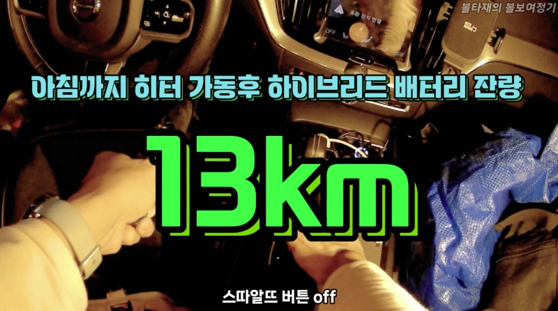 아침까지 히터 가동후 하이브리드 배터리 잔량을 확인해보니 13km가 남아있더군요, 그러니까, 약 8시간 동안 3번 정도 잠깐 틀고 5~7km를 쓴겁니다.