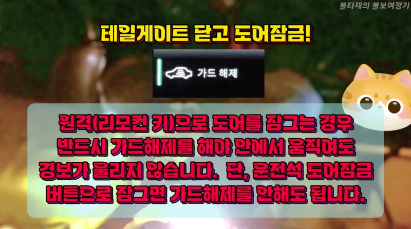 아 그리고, 볼보차량의 경우 가드해제가 중요한데요, 누구오토 운영시스템 미만(티맵) 연식의 차량기준으로 차안에서 리모컨으로 문을 잠그는 경우 가드해제를 꼭 하시기 바랍니다. 가드해제가 안된 상태에서 리모컨으로 문을 잠그면 차안에 리모컨이 있는지 인식이 인될 수 있고, 이 상태에서 차안에서 움직이는 경우 센서가 감지되어 경보가 울릴수 있습니다. 단, 운전석 도어의 잠금버튼을 사용하여 잠그는 경우, 가드해제를 하지 않아도 됩니다. 사람이 안에서 잠궜다고 볼보 차량 시스템이 인지하기 때문이죠. 누구오토(티맵) 운영시스템이 적용된 볼보 차량은 실 차주님 경험담 및 제가 직접 확인한 바로는 가드해제는 없고, 단계조절만 있어서 결국 경보가 울린다 카더군요. 이런 경우 운전석의 도어 잠금 버튼을 사용하시면 될 것 같습니다. 저는 차박캠핑시 리모컨키를 사용하지 않고 방수키를 사용해서 운전석 도어잠금으로 잠궜습니다... 그치만 이것도 함정이 있었으니...