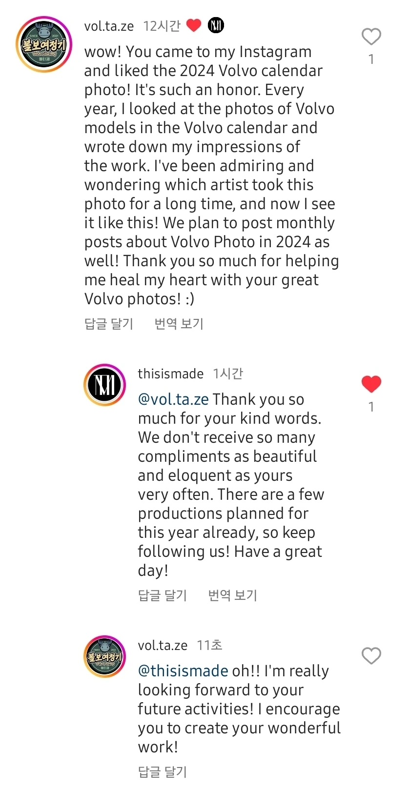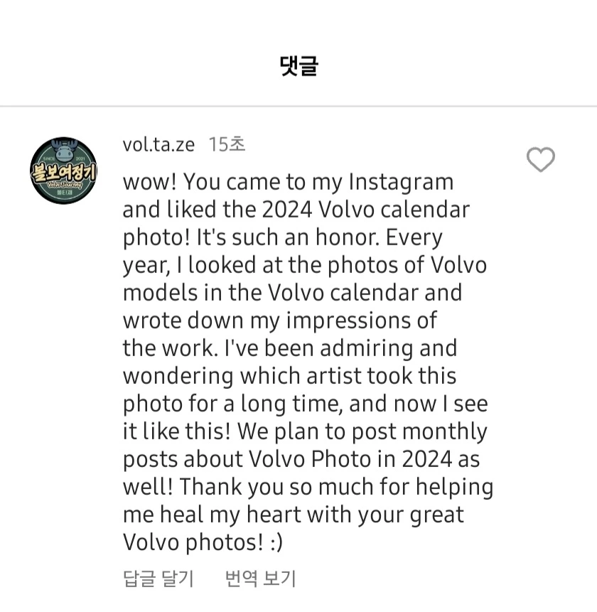 와우!! 귀하 께서 저의 인스타그램에 친히 오셔서 볼보 캘린더 사진에 좋아요를 해주시다니 너무나 영광입니다! 매년 저는 이 볼보 모델 사진을 보면서 저만의 감상 아티클을 썼습니다. 오랫동안 볼보모델 사진을 보면서 감탄하고 과연 이 사진들은 누가찍었을까 궁금했었는데 이렇게 보게 되네요! 2024년에도 매월마다 볼보사진의 감상 아티클을 쓸 예정입니다. 머흣진 볼보 사진으로 제 마음의 힐링을 하게 해주어 느므느므 감사합니다!