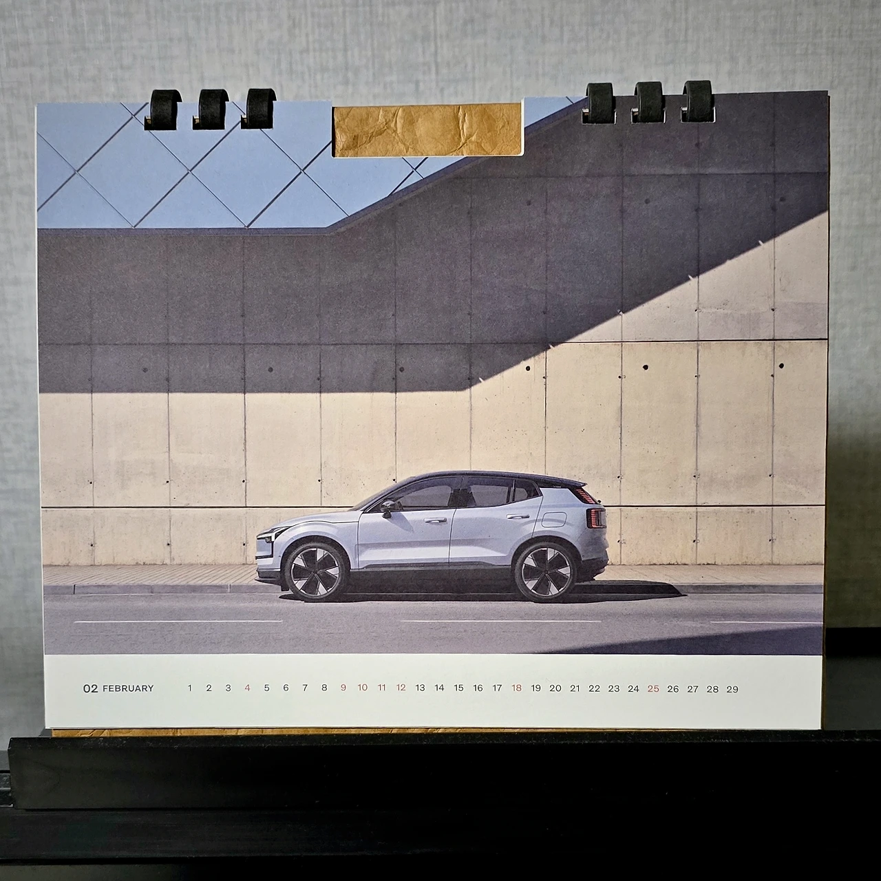 볼보 달력 2월의 이미지는 볼보의 가장 작은 전기차 EX30의 측면샷입니다. 컬러는 EX30의 시그니쳐 컬러인 클라우드 블루(컬러코드 626)입니다.