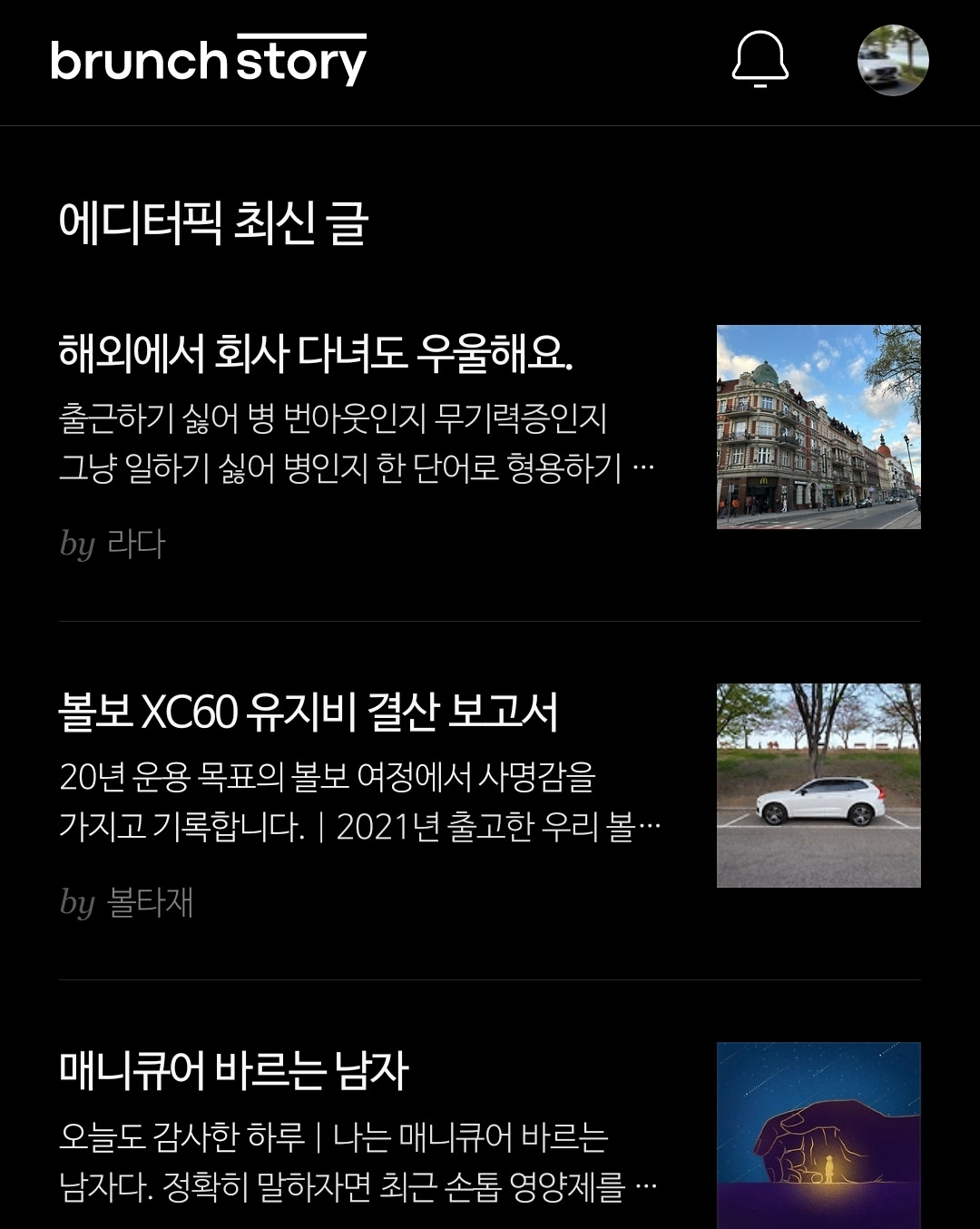 네.... 브런치 에디터님인지... 에디터를 가장한 알고리즘인지... '볼보 XC60 유지비 보고서' 글이 에디터픽으로 브런치 메인 페이지에 이렇게 딱! 떠있더군요....