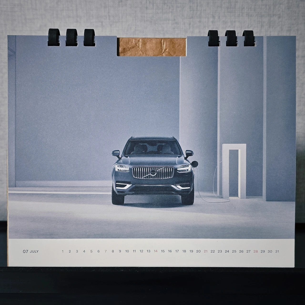 본격적인 여름의 무더위가 시작되는 7월의 볼보 달력 모델은 데님블루컬러(컬러코드:723)의 XC90 T8플러그인 하이브리드입니다.
