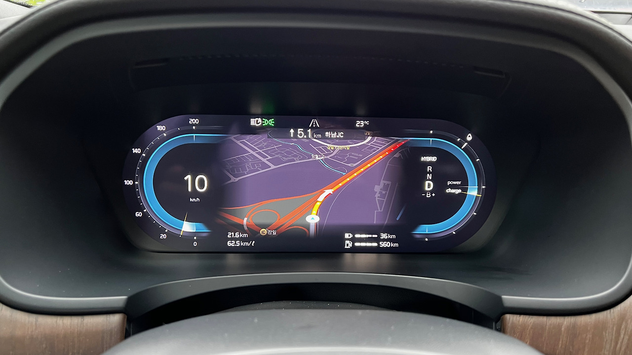 아파트 주차장을 빠져나가는 길. 조용하다. 전기차처럼 달린다. 59km를 주행할 수 있다지만 많은 이들의 시승기에는 70km까지도 문제 없다고 한다. 다만 서울 시내처럼 가다 서다를 반복하는 조건에서 더 효율이 좋다. 전기차의 특성인데 이 차도 마찬가지다. 주행거리 21.6km에 남은 배터리를 살펴보니 36km를 더 달릴 수 있다고 한다. 엔진을 거의 사용하지 않아서 나온 수치다.